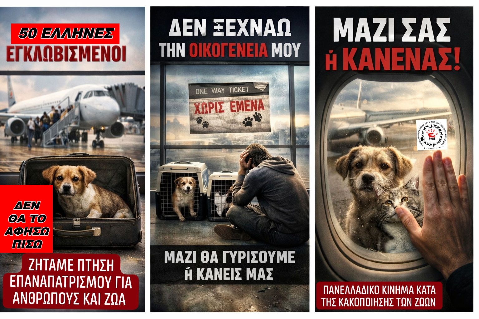 Το ΠΑΝΕΛΛΑΔΙΚΟ ΚΙΝΗΜΑ ΚΑΤΑ ΤΗΣ ΚΑΚΟΠΟΙΗΣΗΣ ΤΩΝ ΖΩΩΝ εκφράζει την έντονη ανησυχία και αγανάκτησή του, για την κατάσταση που αντιμετωπίζουν αυτή τη στιγμή περισσότεροι από 50 Έλληνες πολίτες στα Ηνωμένα Αραβικά Εμιράτα, οι οποίοι αδυνατούν να επαναπατριστούν στην Ελλάδα επειδή αρνούνται – δικαίως – να εγκαταλείψουν τα ζώα συντροφιάς τους.
