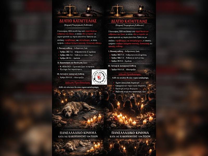 Ο Ιανουάριος του 2026 συνοδεύτηκε από σειρά θανάτων ανθρώπων και ζώων, οι οποίοι, με βάση τα πραγματικά δεδομένα και το ισχύον νομικό πλαίσιο, δεν μπορούν να χαρακτηριστούν ως τυχαία γεγονότα.