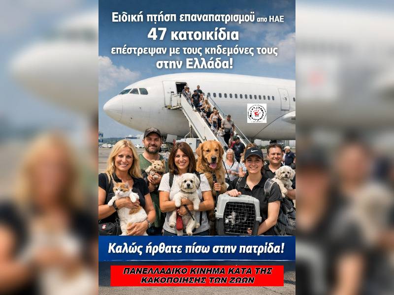 ΤΟ ΠΑΝΕΛΛΑΔΙΚΟ ΚΙΝΗΜΑ ΚΑΤΑ ΤΗΣ ΚΑΚΟΠΟΙΗΣΗΣ ΤΩΝ ΖΩΩΝ χαιρετίζει την πραγματοποίηση της πτήσης επαναπατρισμού από τα ΗΑΕ, μέσω της οποίας δεκάδες Έλληνες πολίτες επιστρέφουν στη χώρα τους μαζί με τα κατοικίδιά τους.