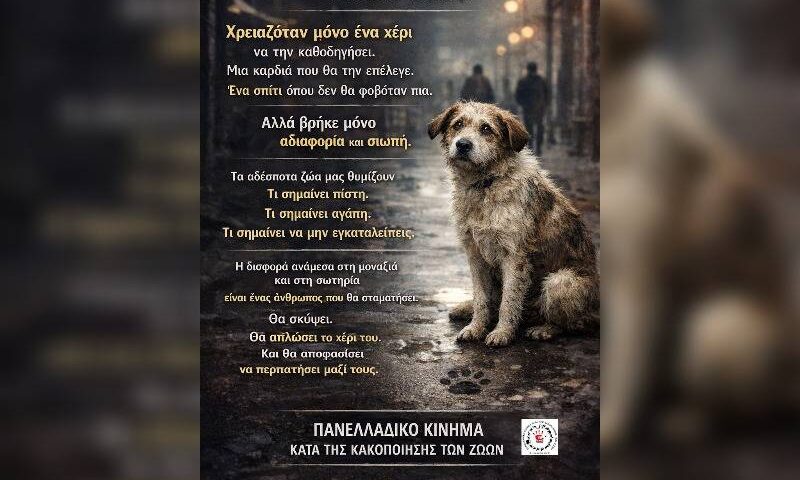 Ένα μήνυμα για την Πρόεδρο του Πανελλαδικού Κινήματος Κατά της Κακοποίησης των Ζώων Σε έναν κόσμο που συχνά επιλέγει την αδιαφορία αντί για την ευθύνη,…