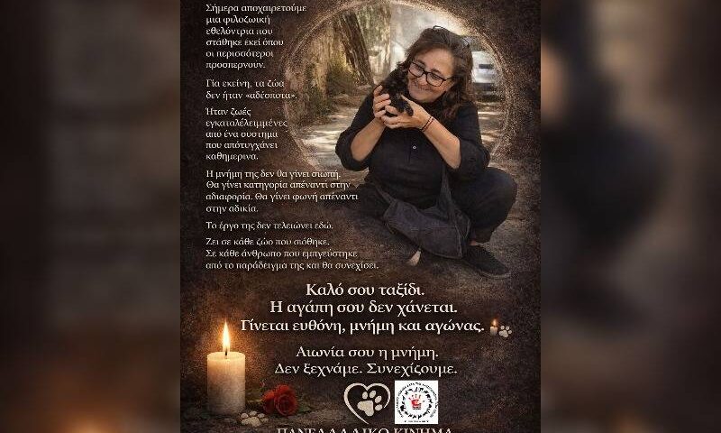 Σήμερα αποχαιρετούμε μια φιλοζωική εθελόντρια που δεν έζησε αδιάφορα. Μια γυναίκα που στάθηκε εκεί όπου οι περισσότεροι προσπερνούν. Στα πεζοδρόμια. Στα σκοτάδια. Στις πληγές που…