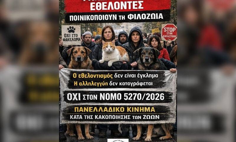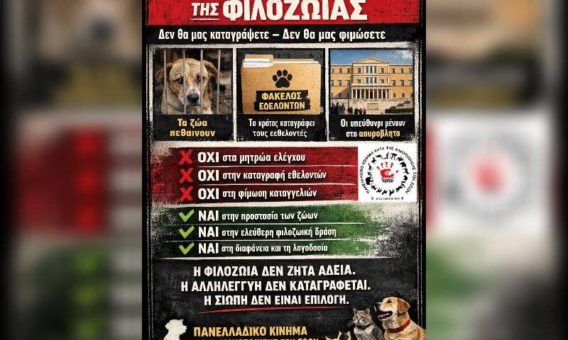 Περισσότερα Το κράτος «φακελώνει» τον εθελοντισμό – Ποινικοποιούν τη φιλοζωία και την κοινωνική δράσηΕτικέτα: ΦΑΚΕΛΩΜΑ ΦΙΛΟΖΩΙΚΩΝ ΣΩΜΑΤΕΙΩΝ ΚΑΙ ΕΘΕΛΟΝΤΩΝ ΑΠΟ ΤΟ ΚΡΑΤΟΣ ΚΑΤΑΓΓΕΛΕΙ ΤΟ ΠΑΝΕΛΛΑΔΙΚΟ ΚΙΝΗΜΑ ΚΑΤΑ ΤΗΣ ΚΑΚΟΠΟΙΗΣΗΣ ΤΩΝ ΖΩΩΝ